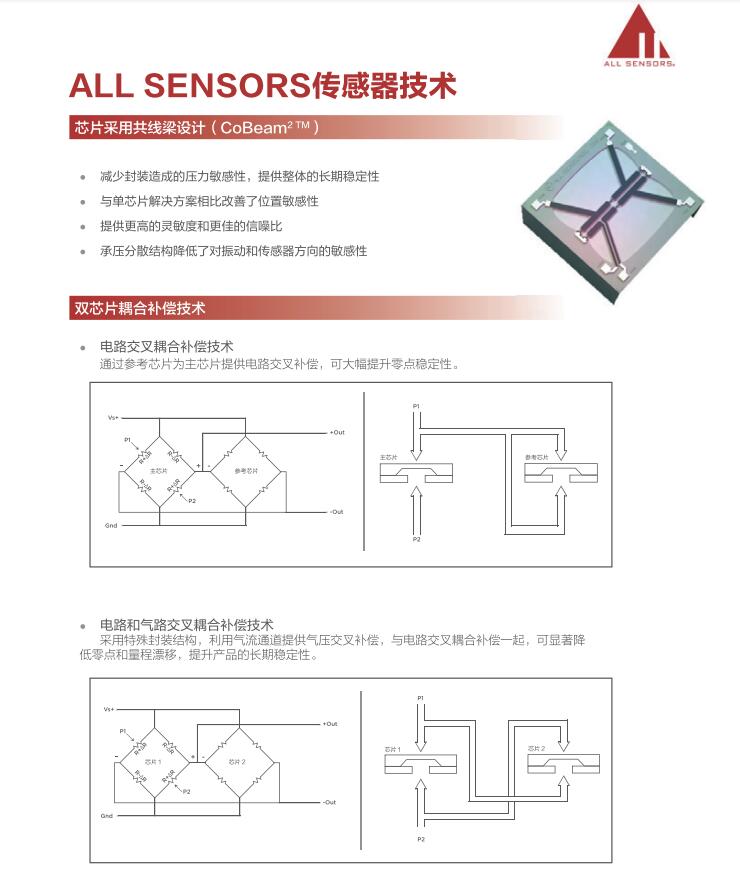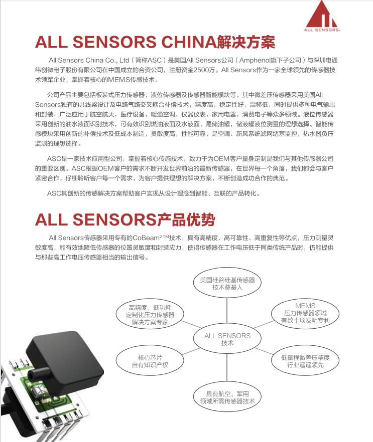 美國All Sensors (All Sensors Corporation.)是一家技術(shù)應(yīng)用型公司,是全球極少數(shù)掌握著核心傳感技術(shù)的公司之一。公司創(chuàng)始人Dennis是美國硅谷傳奇人物,于70年代在硅谷發(fā)明了全球第一顆壓力傳感器。30年來ALLSensors一直致力于為OEM客戶設(shè)計定制非常多經(jīng)典的傳感器,部分經(jīng)典產(chǎn)品并被業(yè)界某大公司收購并發(fā)揚光大。 All Sensors掌握著世界領(lǐng)先的MEMS傳感器技術(shù),如獨有的CoBeam2 TM傳感器技術(shù)等。